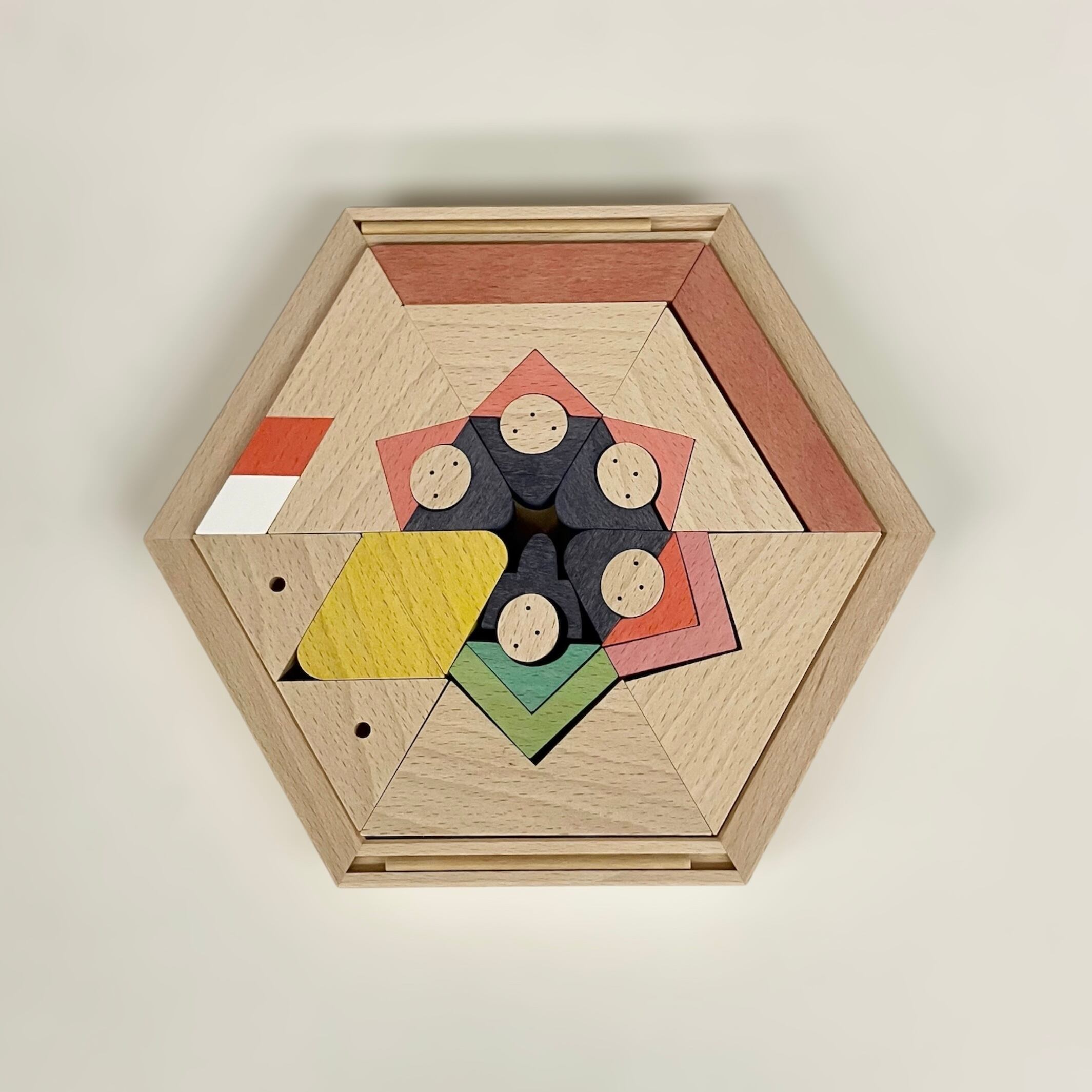 ③10枚目は正三角形を三つ組み合わせて台形を二つ作りました。それを六角形の木箱に入れたのが11枚目の写真、場所を入れ替えて好きな模様にしたのが12枚目の写真です。