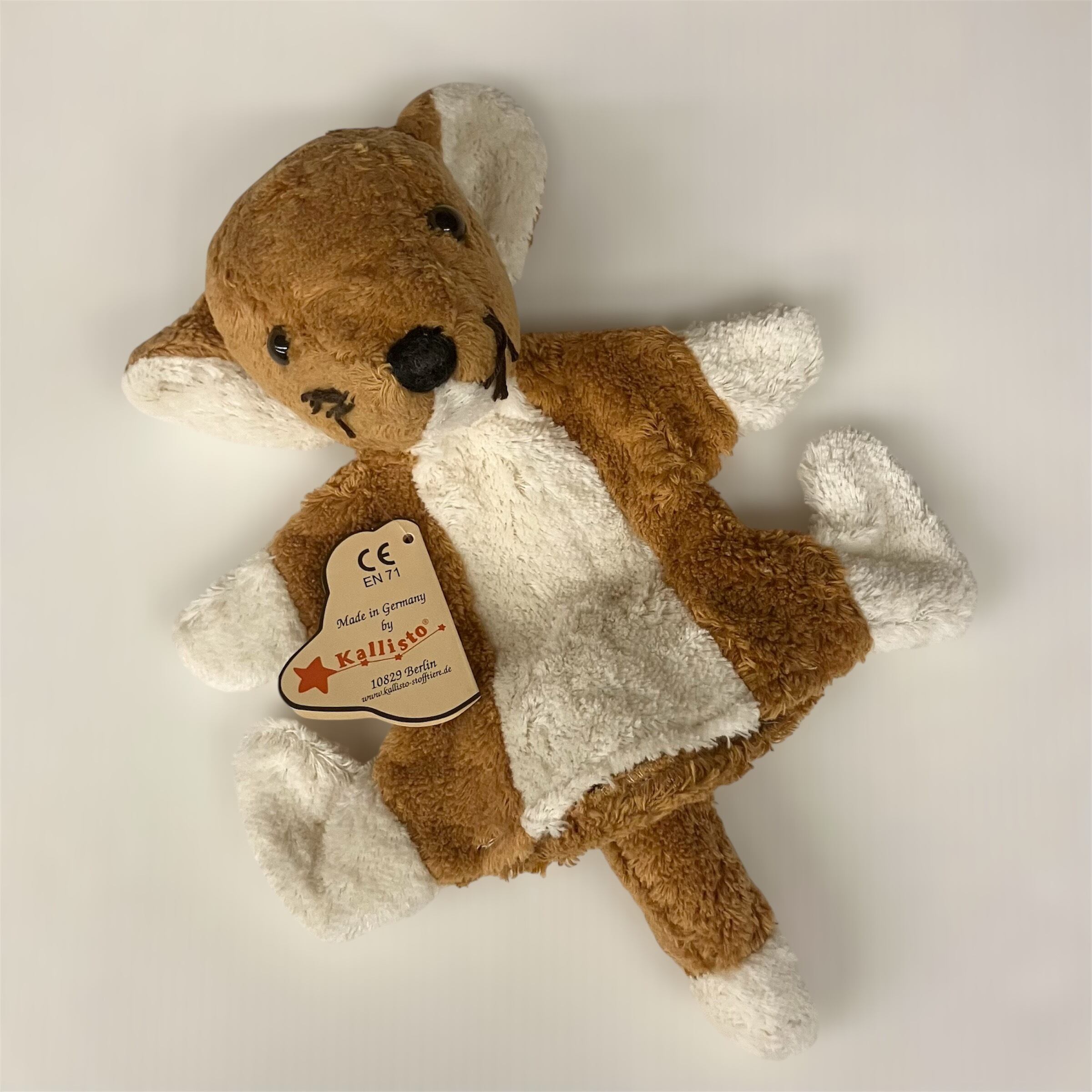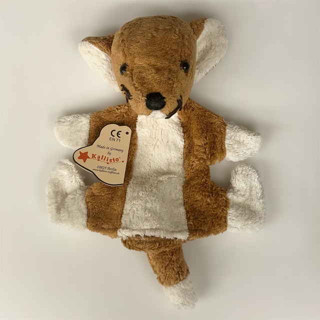 ドイツ・カリスト社の「手人形きつね」です。トロンとしたその目は「きつね」というより「こぎつね」のように見えます。長さは32㎝、重さは120gととても軽いので、お出かけのおともにもピッタリです。