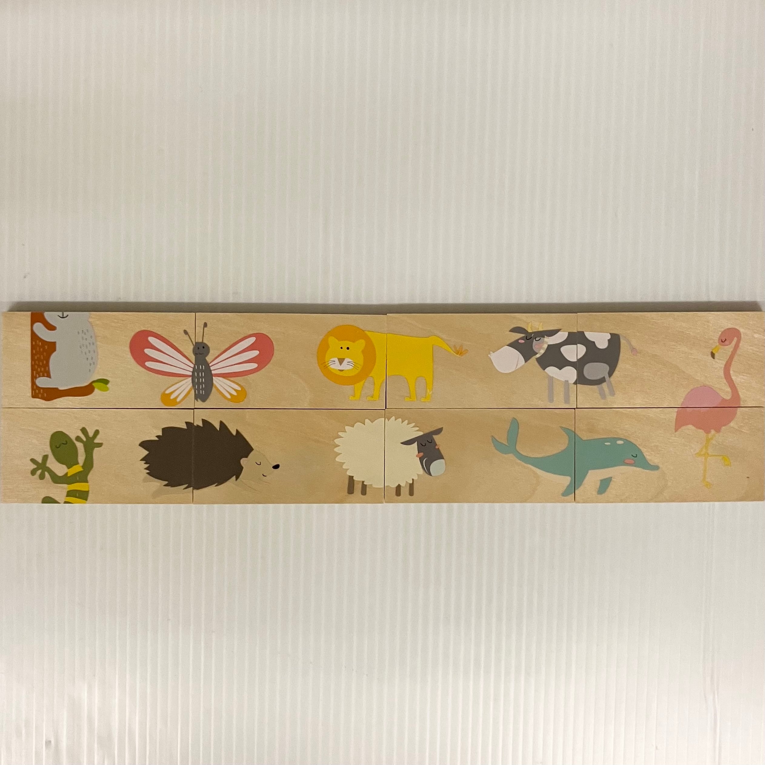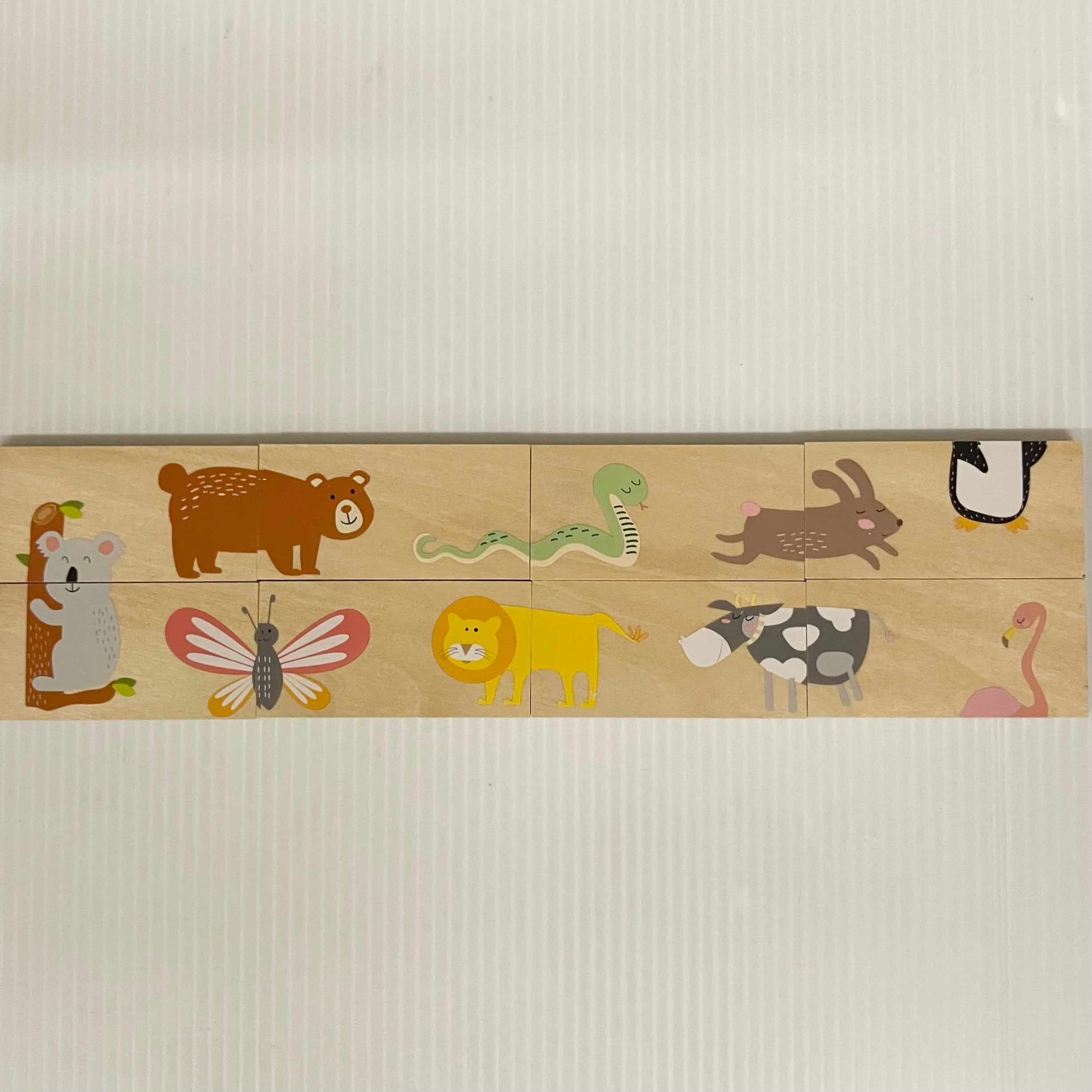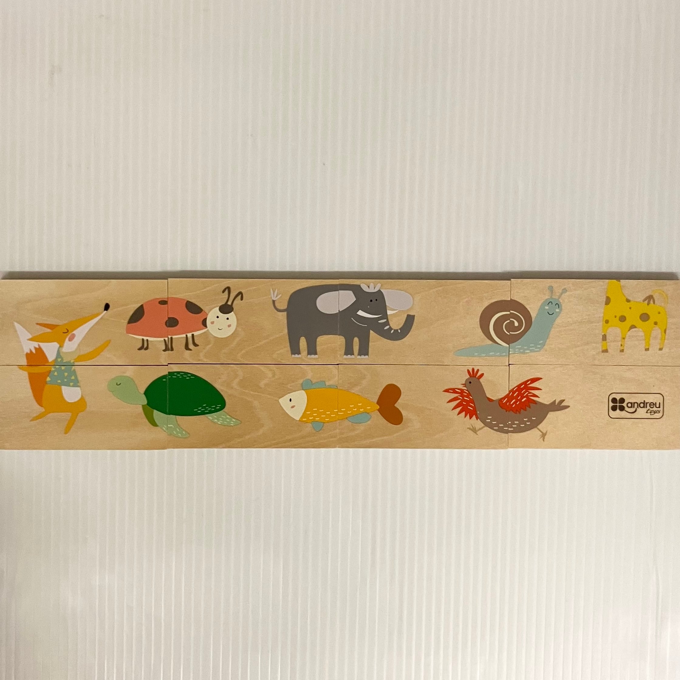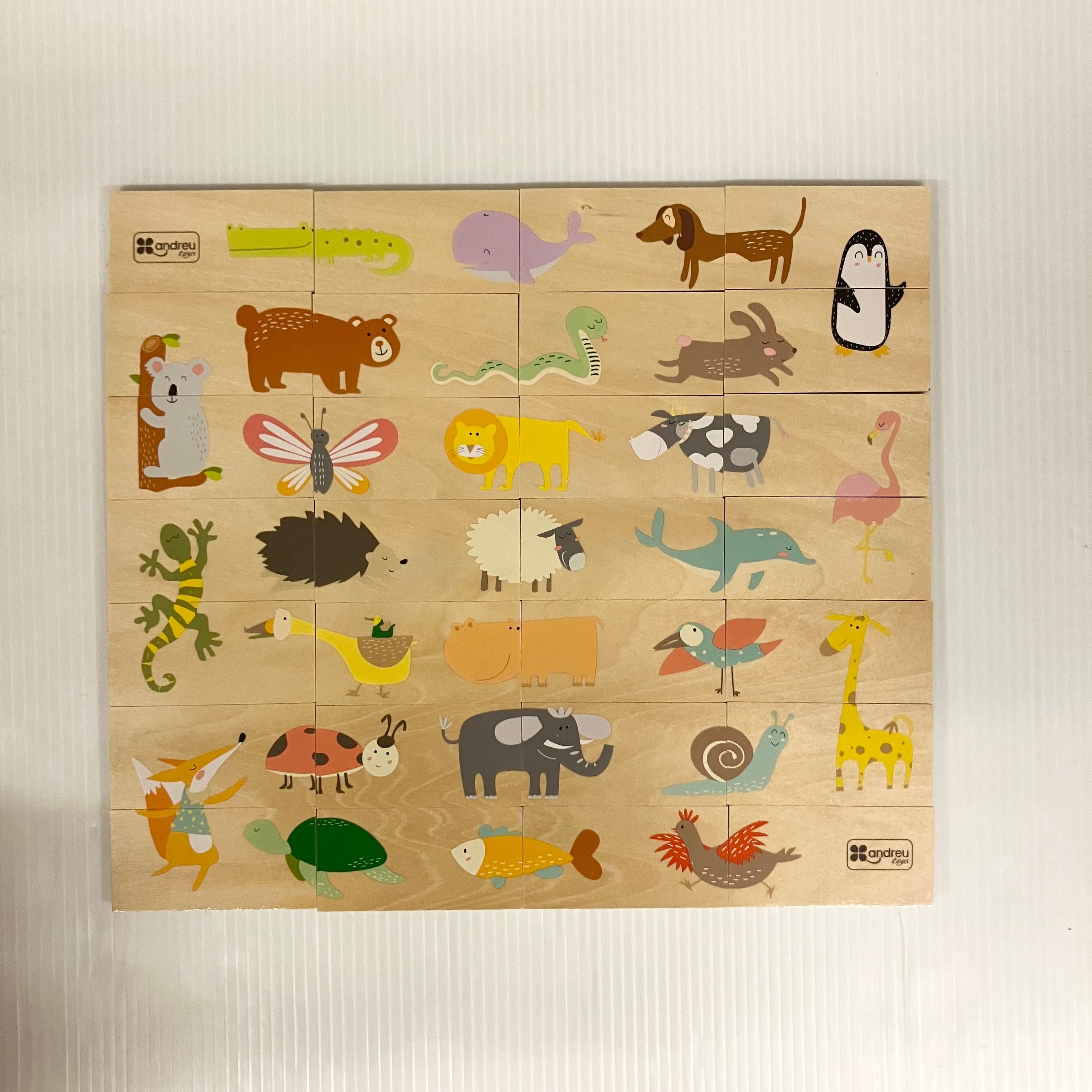 スペイン・アンドリュートイズの「ドミノパズル・アニマル」です。1枚の大きさは4×8㎝、27種の動物が描かれたドミノ板28枚で構成されています。