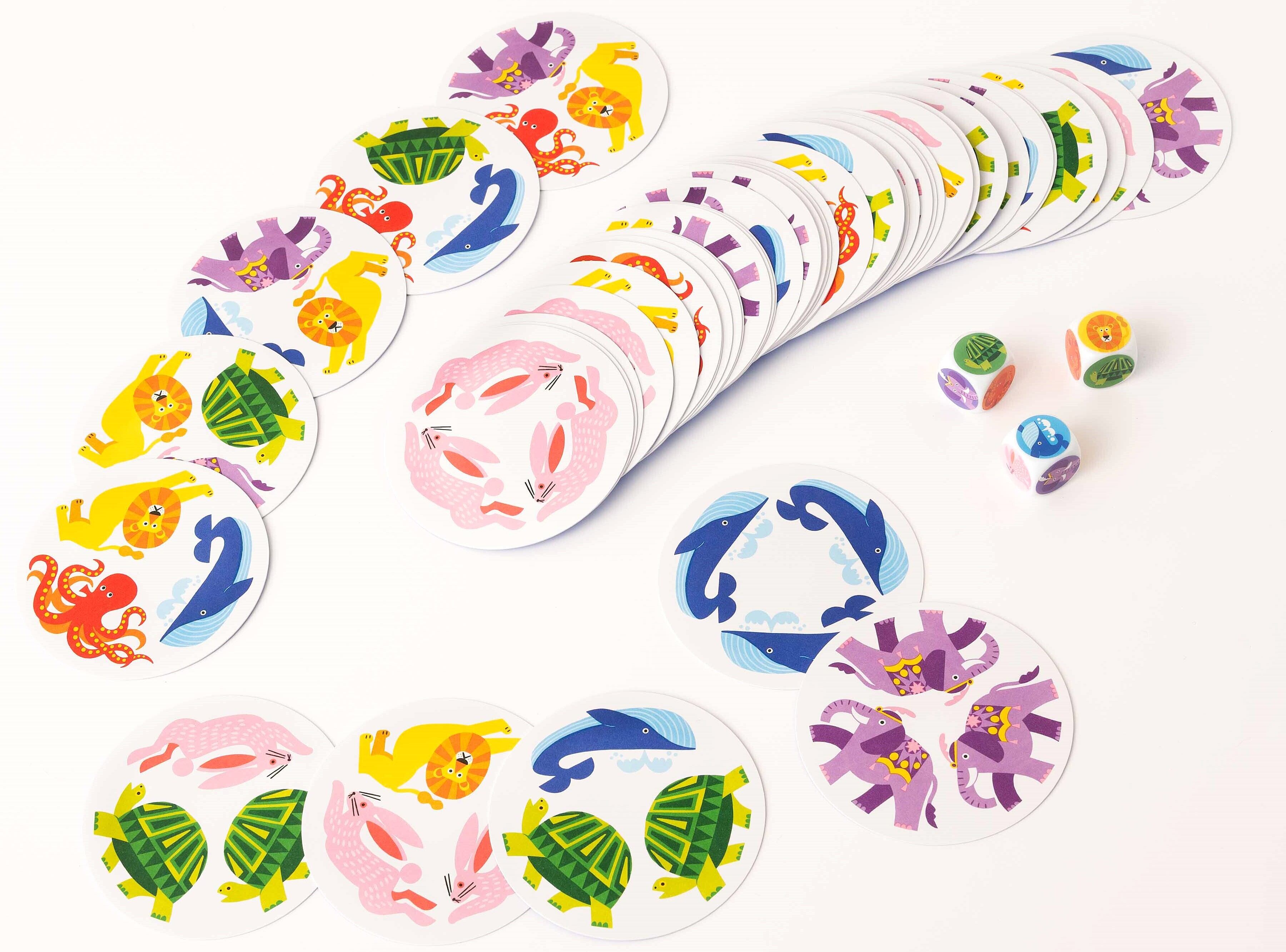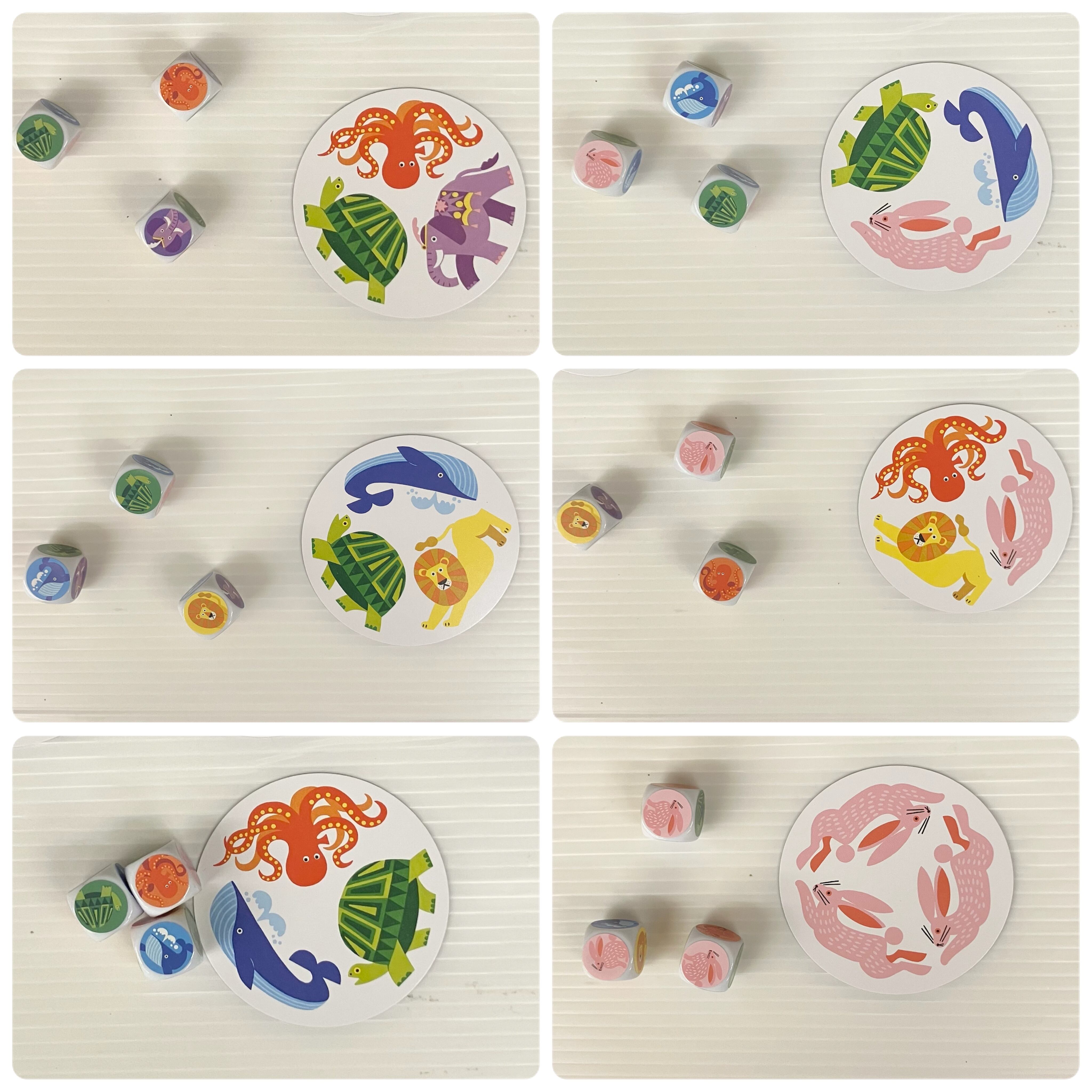 サイコロは1個だけ使い、違う動物が描かれているカードのみ使います。慣れたらサイコロを2個にし、同じ動物が2匹描かれている動物カードも加えます。
