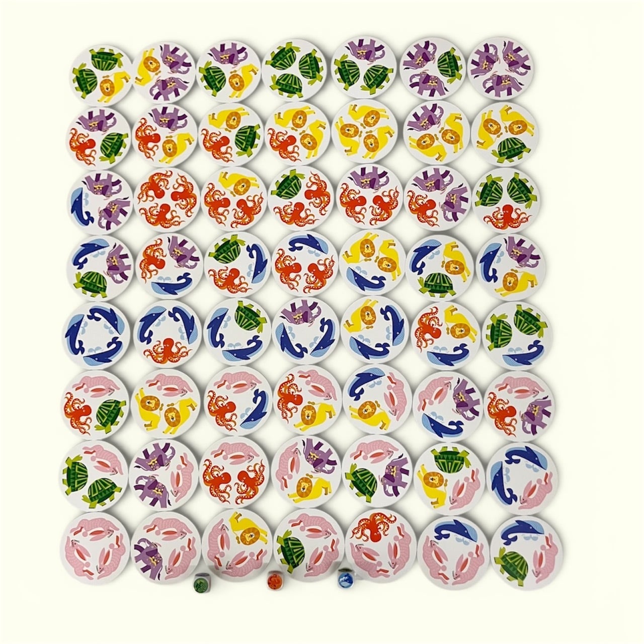 箱の大きさ136×136×36㎜、動物カード56枚、シール台紙1枚、さいころ3個が入っています。*動物のシールは自分で貼ります
