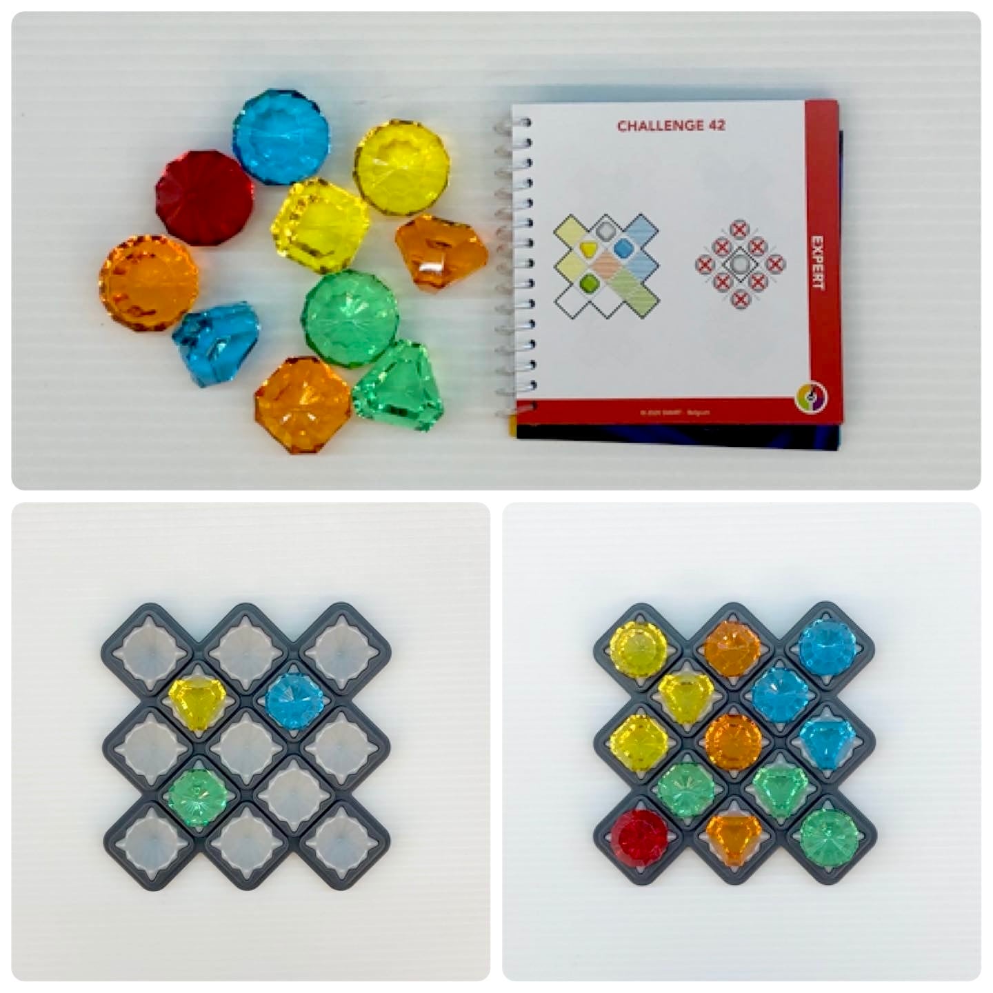 6枚目の写真はEXPERTの問題(42)です。ヒントを頼りに宝石を3個置きます(左下の写真)。