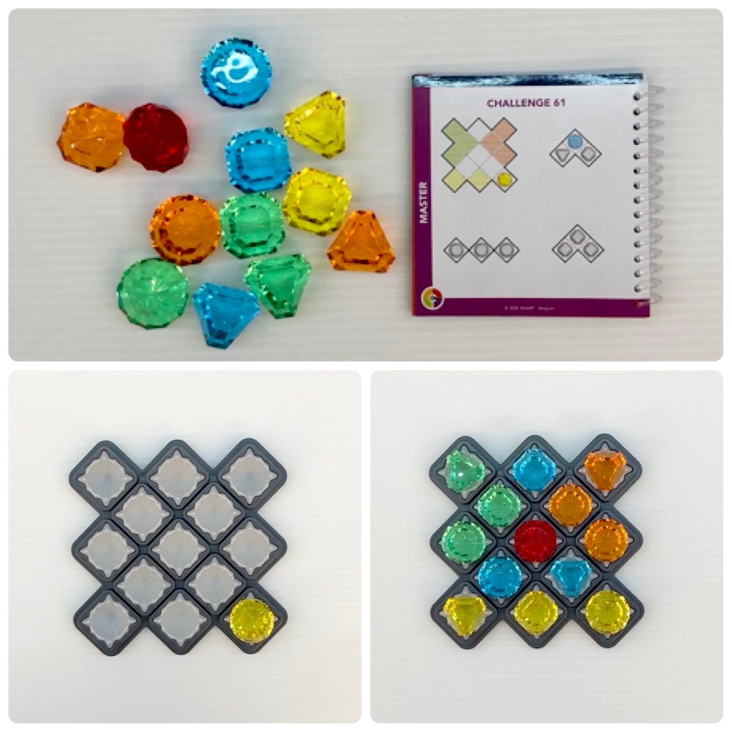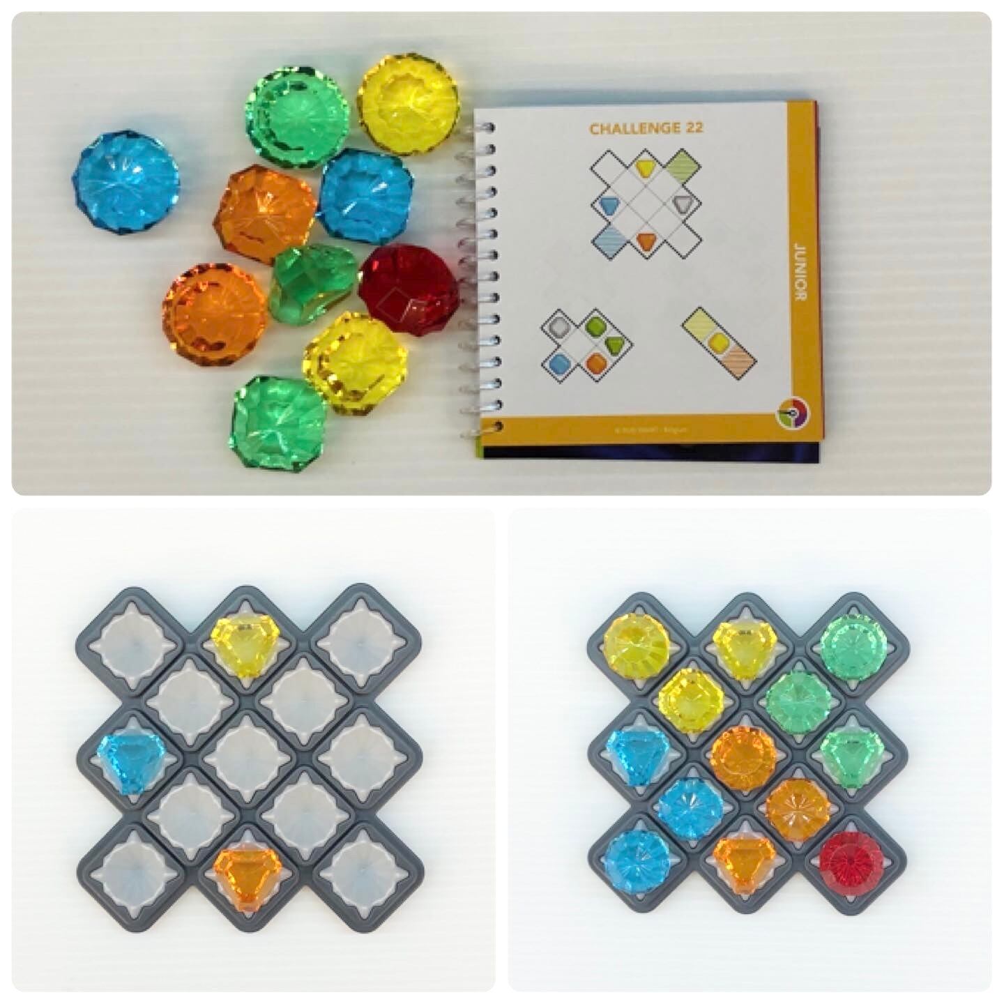 5枚目の写真はJUNIORの(問題22)です。ヒントを頼りに宝石を3個置きます(左下の写真)。