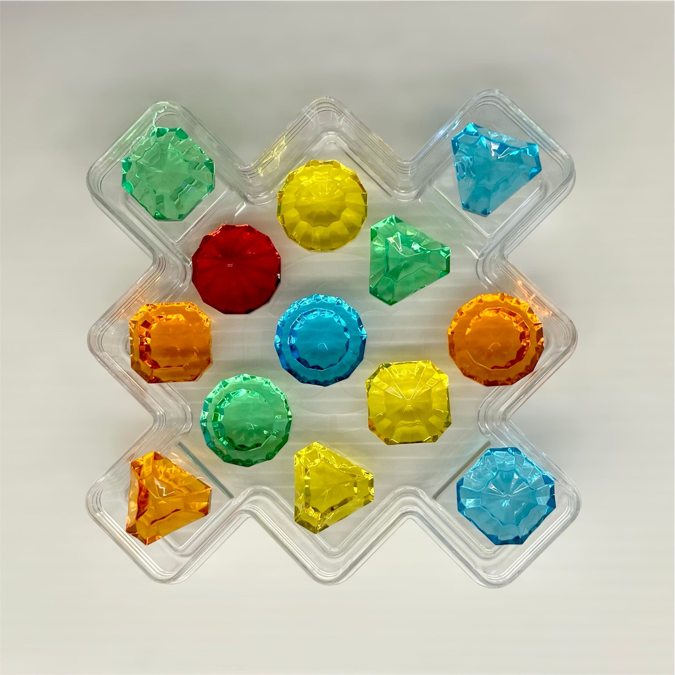 ゲームガイド 1冊 (問題 80問)、丸・三角・四角の透明な宝石ピースが全部で13個入っています(1枚目の写真)。
