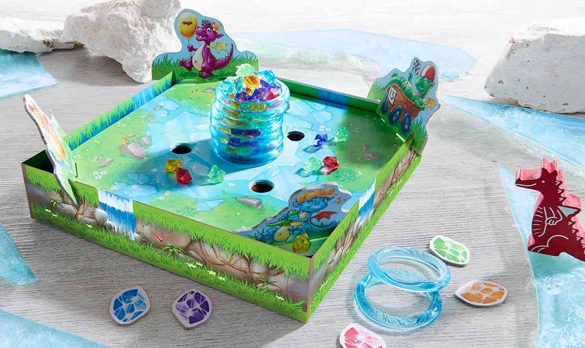 『きらめく財宝』は、氷の柱から落ちてくる宝石の色を予測し、対応する色タイルを事前に選んで獲得を狙うゲームです。パパドラゴン役が氷のリングを1つずつ取り除くたびに宝石がこぼれ落ち、各自が選んだ色タイルと同じ色の宝石をすべて獲得します。氷の柱の中身を観察して狙いを定める駆け引きが楽しめます。
