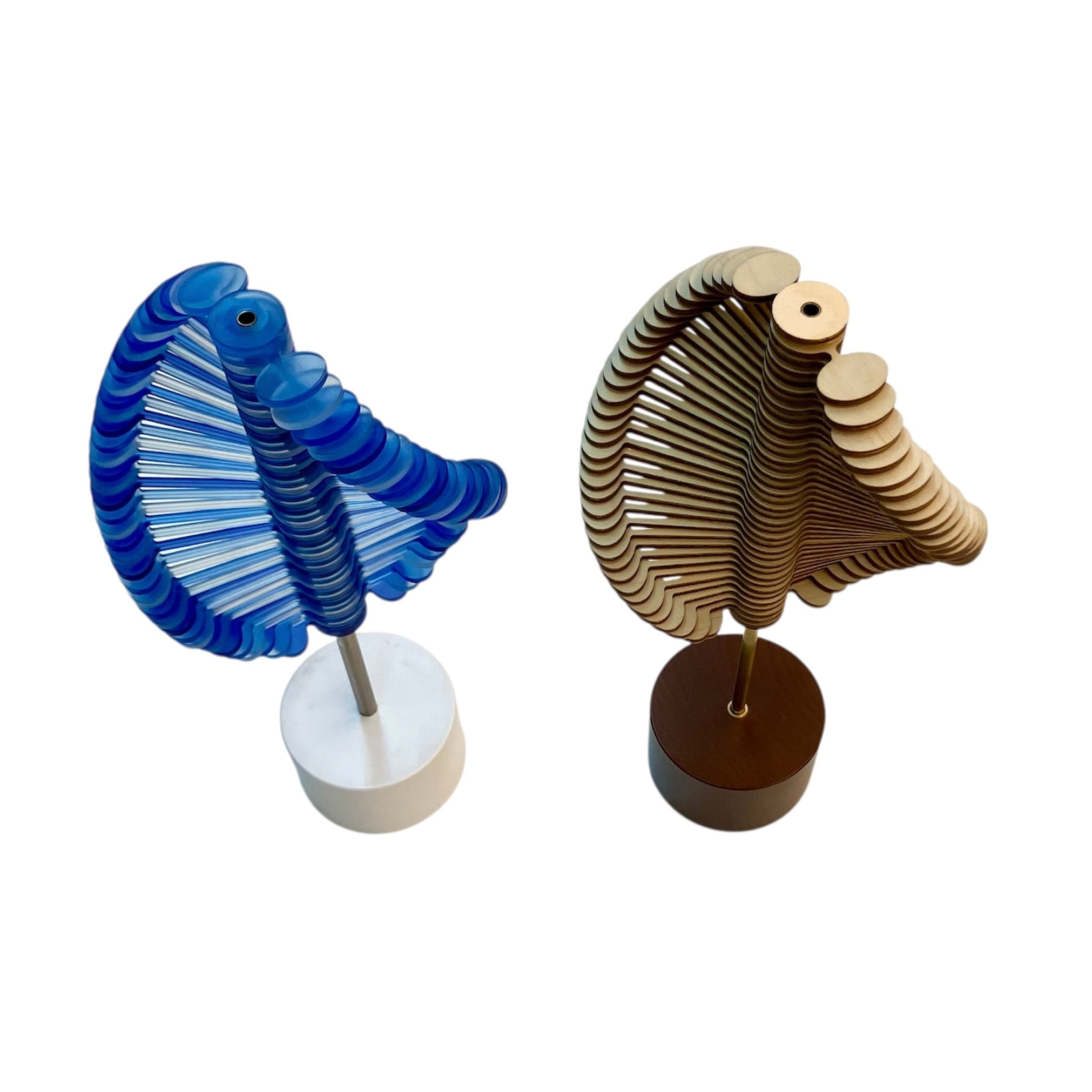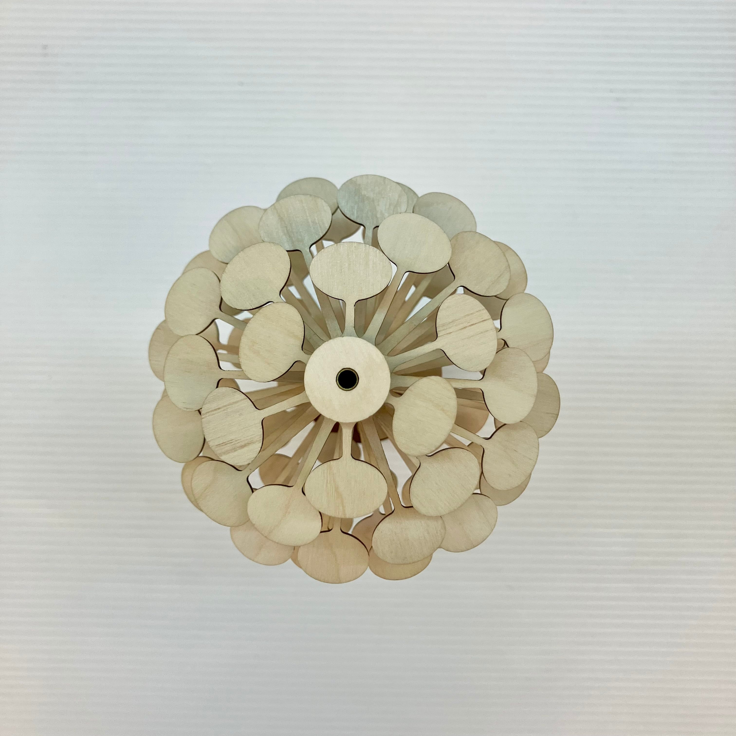 3〜4枚目は前から撮った写真、5〜7枚目は上から撮った写真です。螺旋状と松かさ状の二つの形が全く異なるのがよく分かります。1枚目は箱に入った状態です。本体の高さは26㎝、遊ばない時はスタンドに立てて飾ります。小学生から大人の方へのプレゼントにもお勧めです。