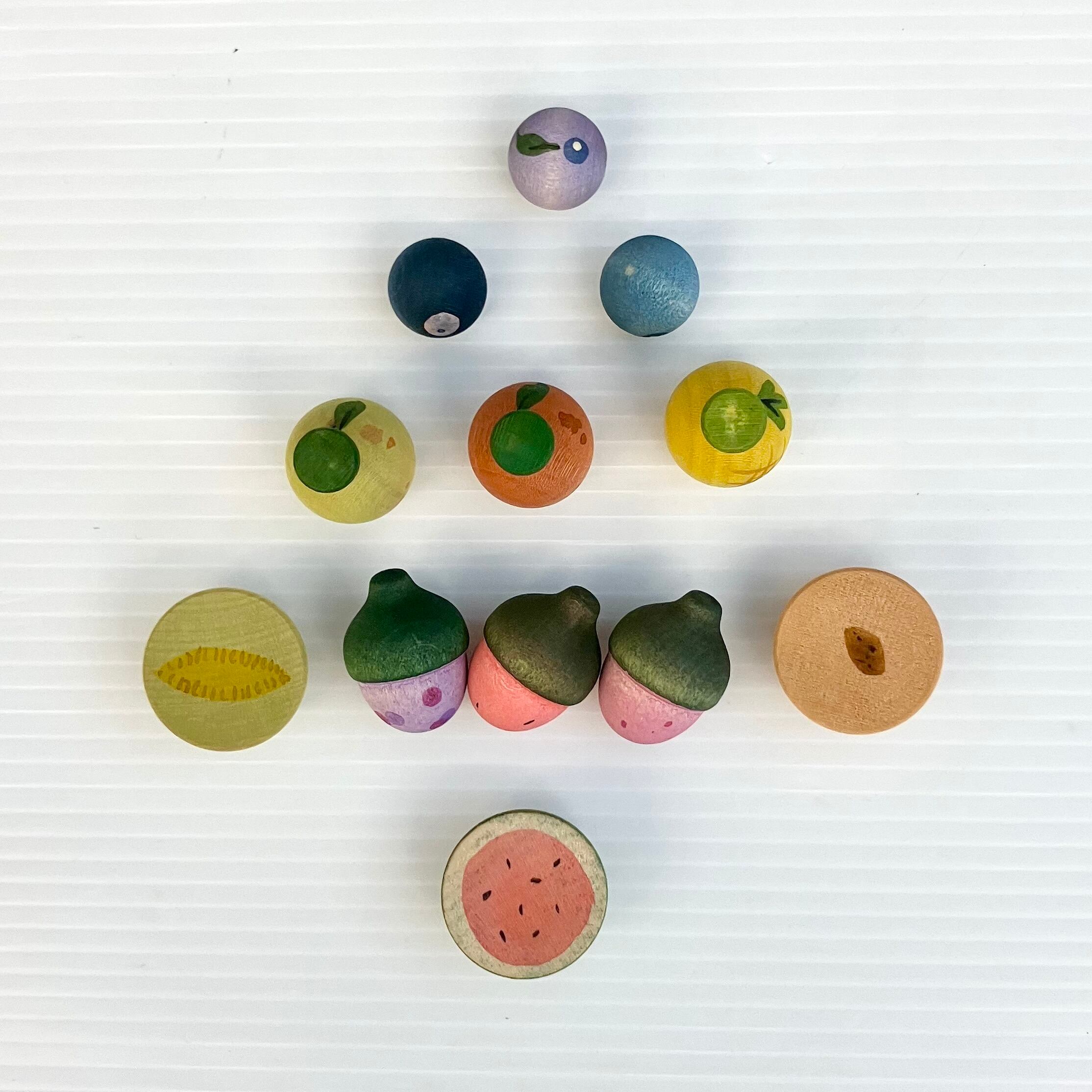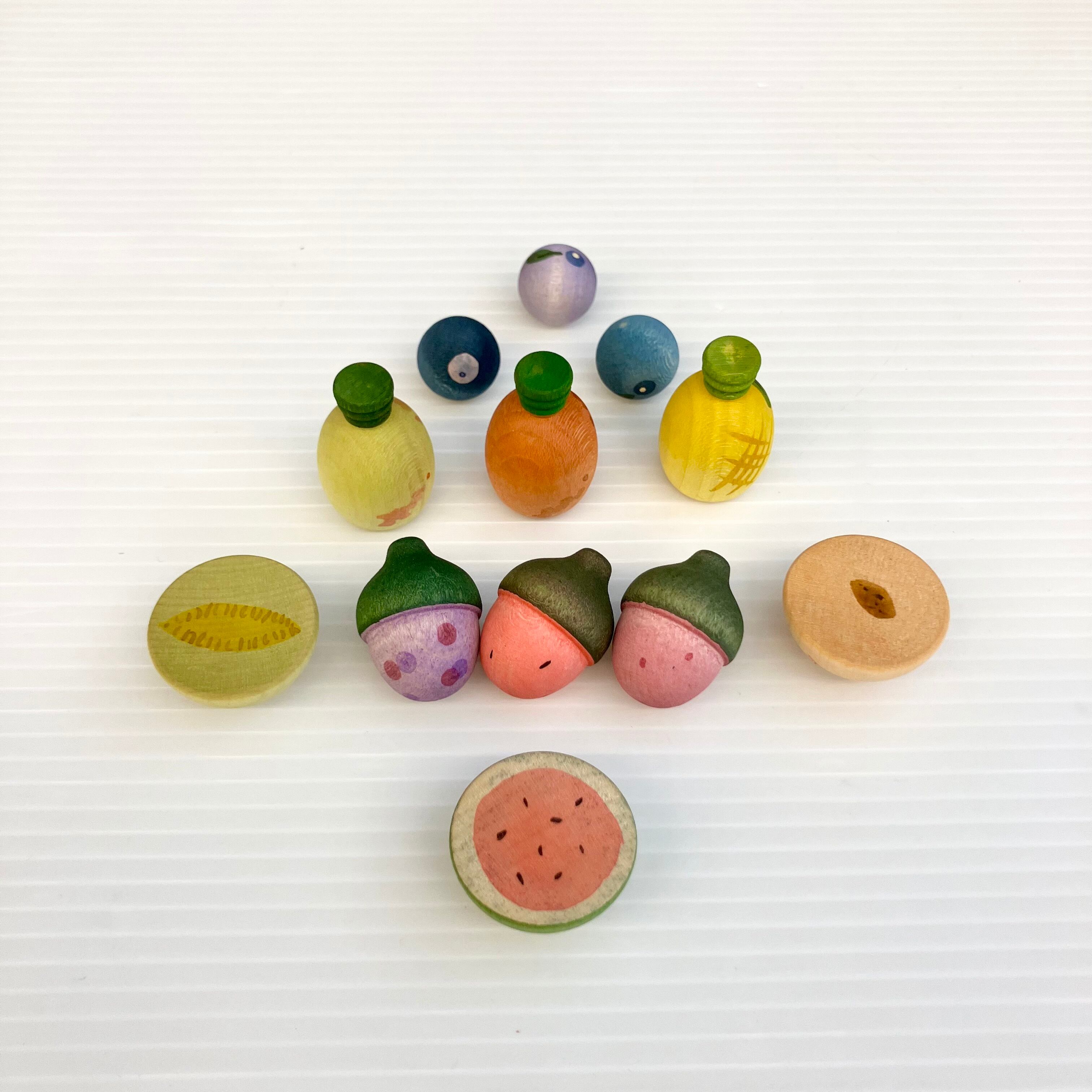 フルーツの大きさは1.8〜3.8㎝、一番下にスイカその上にイチゴオレンジレモンブドウブルーベリー美味しそうな果物のセットです。