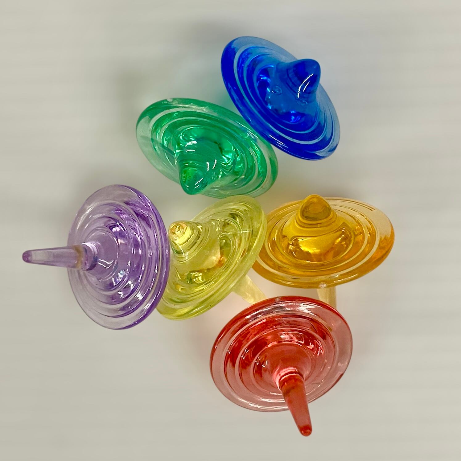 「クリアカラートップ お試し用」です。1個の大きさは4×4×4㎝、透明感のある美しいコマ6個のセットです。