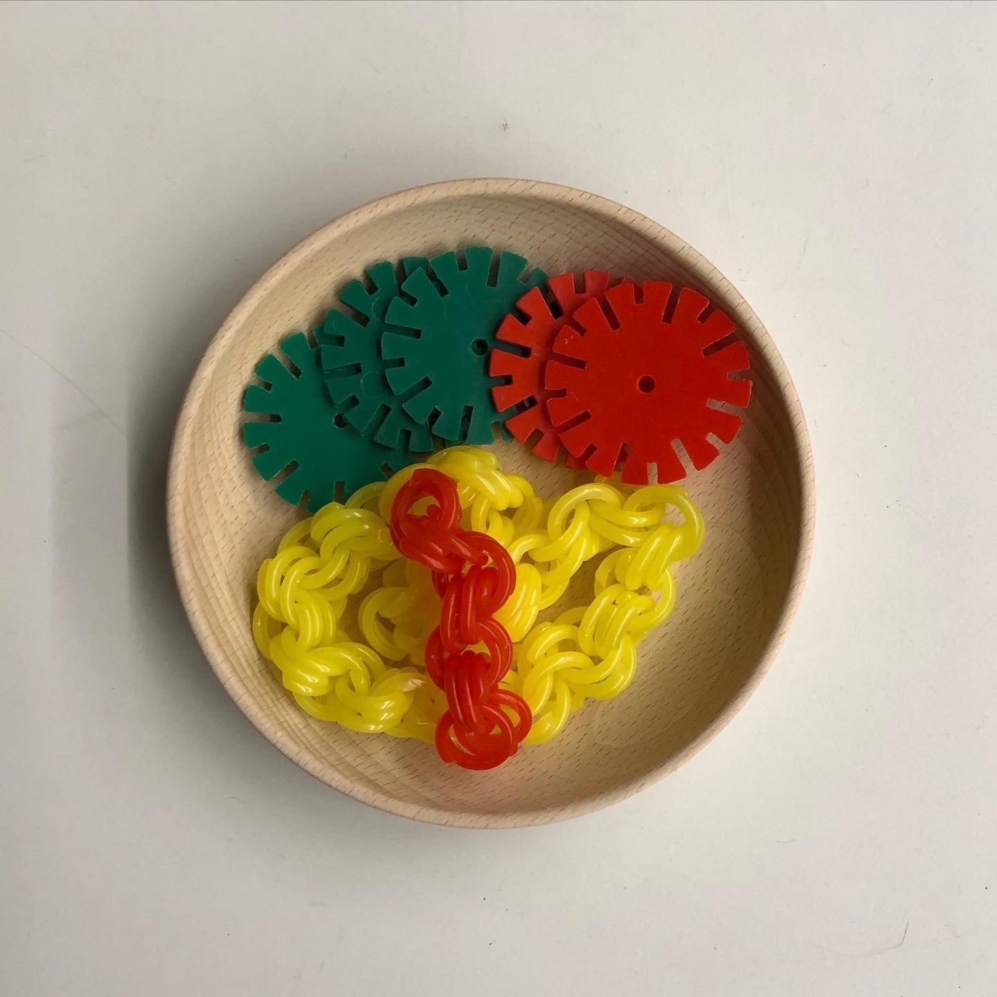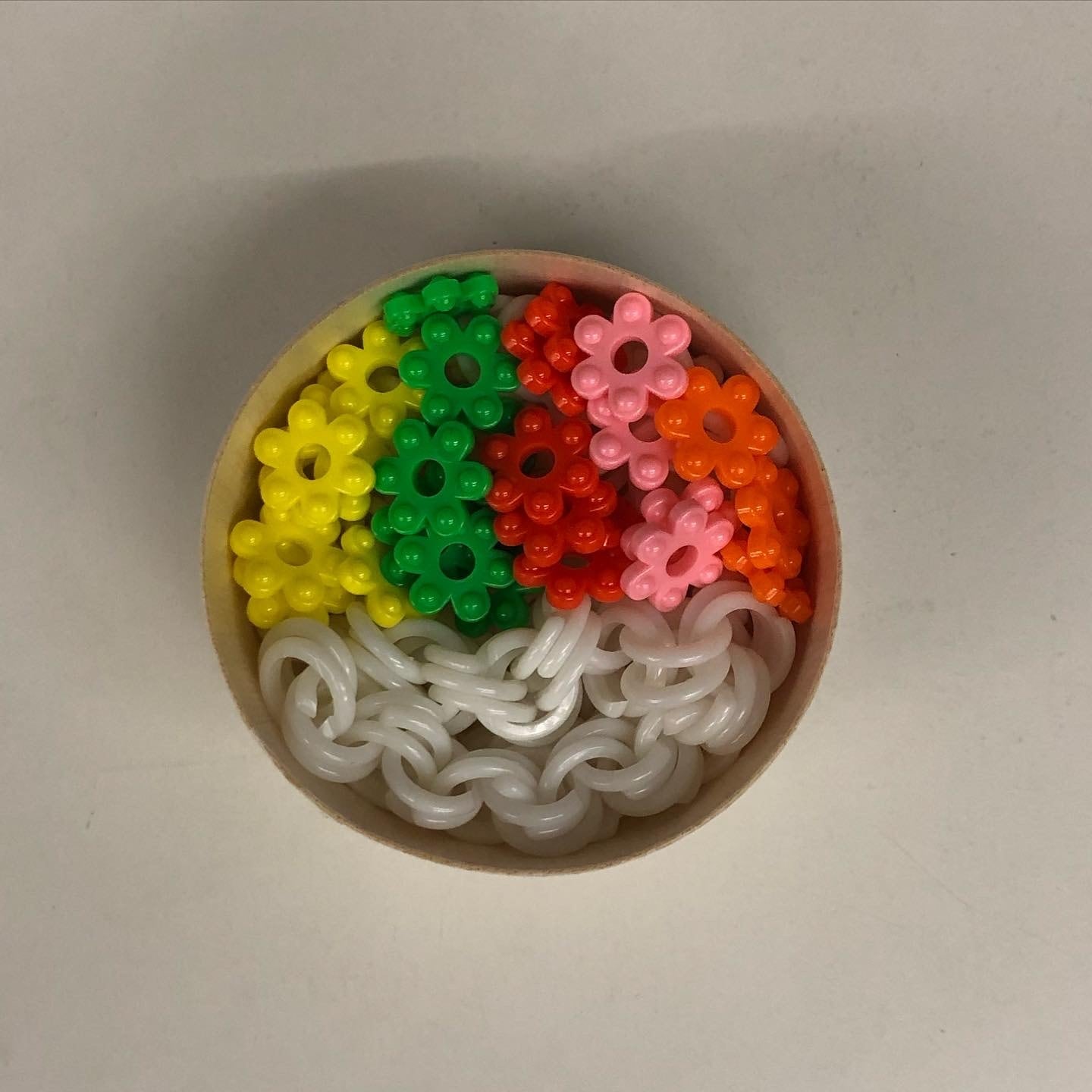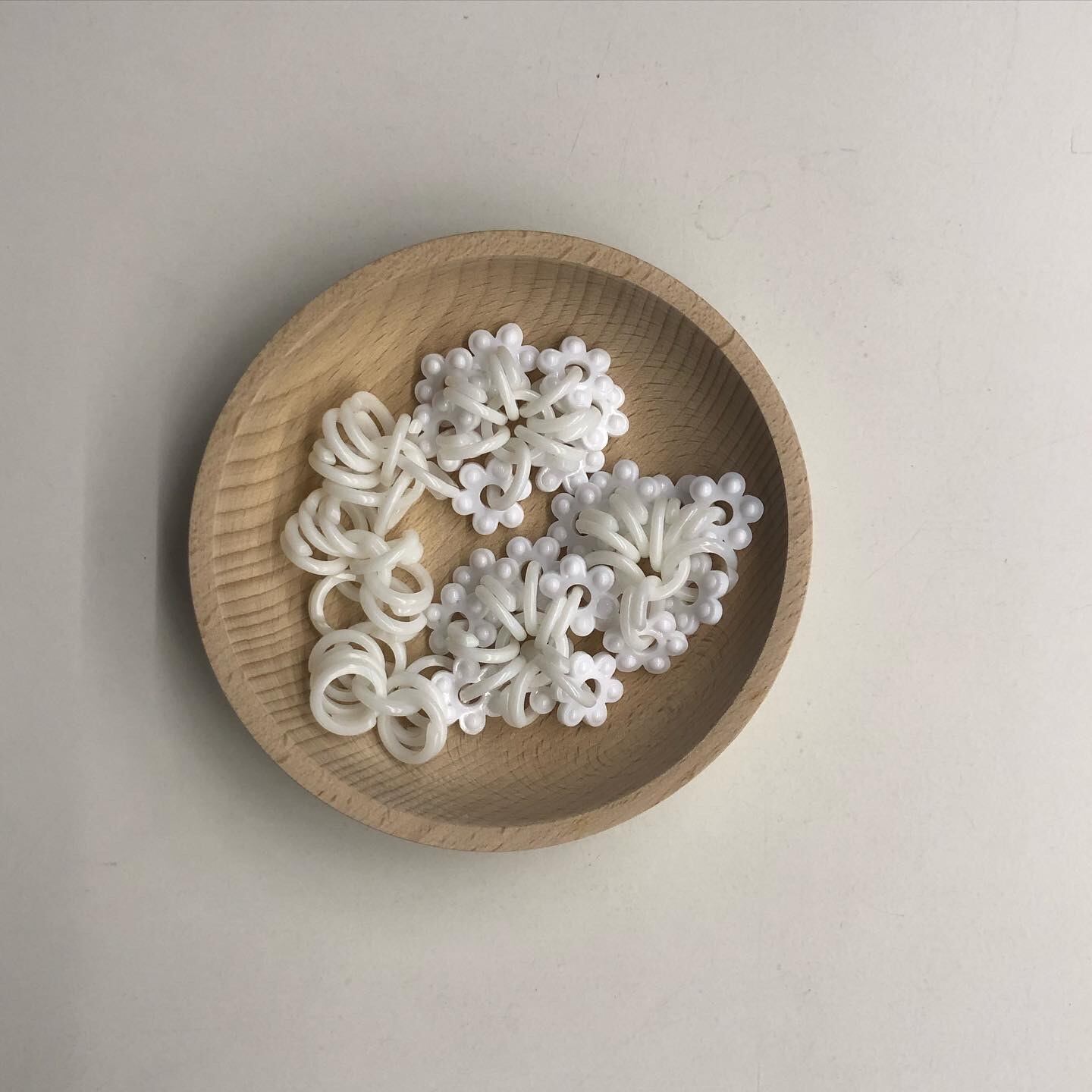 おままごとの基本の食材「チェーンリング200g」です。1〜2歳のころは手ですくって遊びますので、チェーンリング1個に複数個をつなぎ、3枚目の写真のように丸く輪にしておきます。3歳になって見立て遊びが始まったら白いご飯になります。