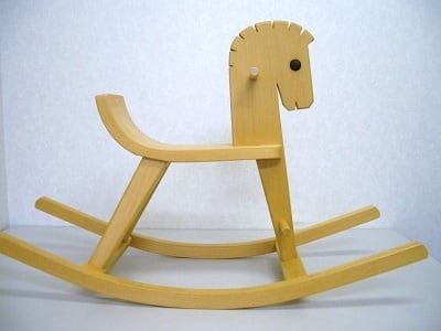 白木の美しい木馬です。座面がゆるやかな曲線になっていて、背もたれの代わりをしてくれます。幅にゆとりがありますから、大人でも乗れそうです。ソリの部分は少し角度があり大きく揺れますが、決して倒れません。日本に来て40年近くなる、長く愛されている木馬です。 品 番:330-1 メーカー: ドイツ ケラー社製 サイズ等: W83×D30×H54㎝ 座面まで30㎝