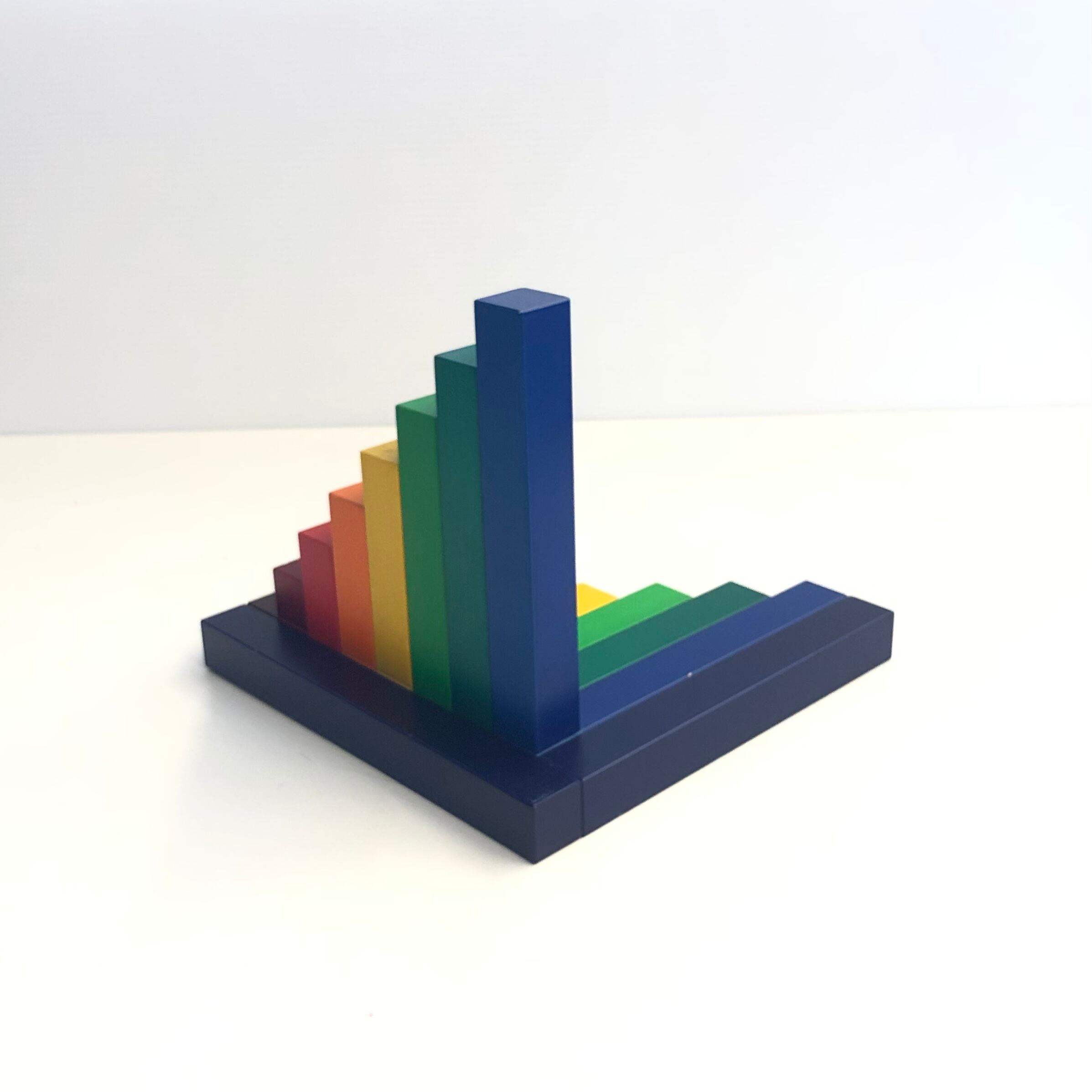 一番大きな積木は22.5cm×22.5cm、一番小さな積木は2.5×2.5㎝、積木は全9ピース、立たせたりバランスをとるためのステンダーが4個付いています。