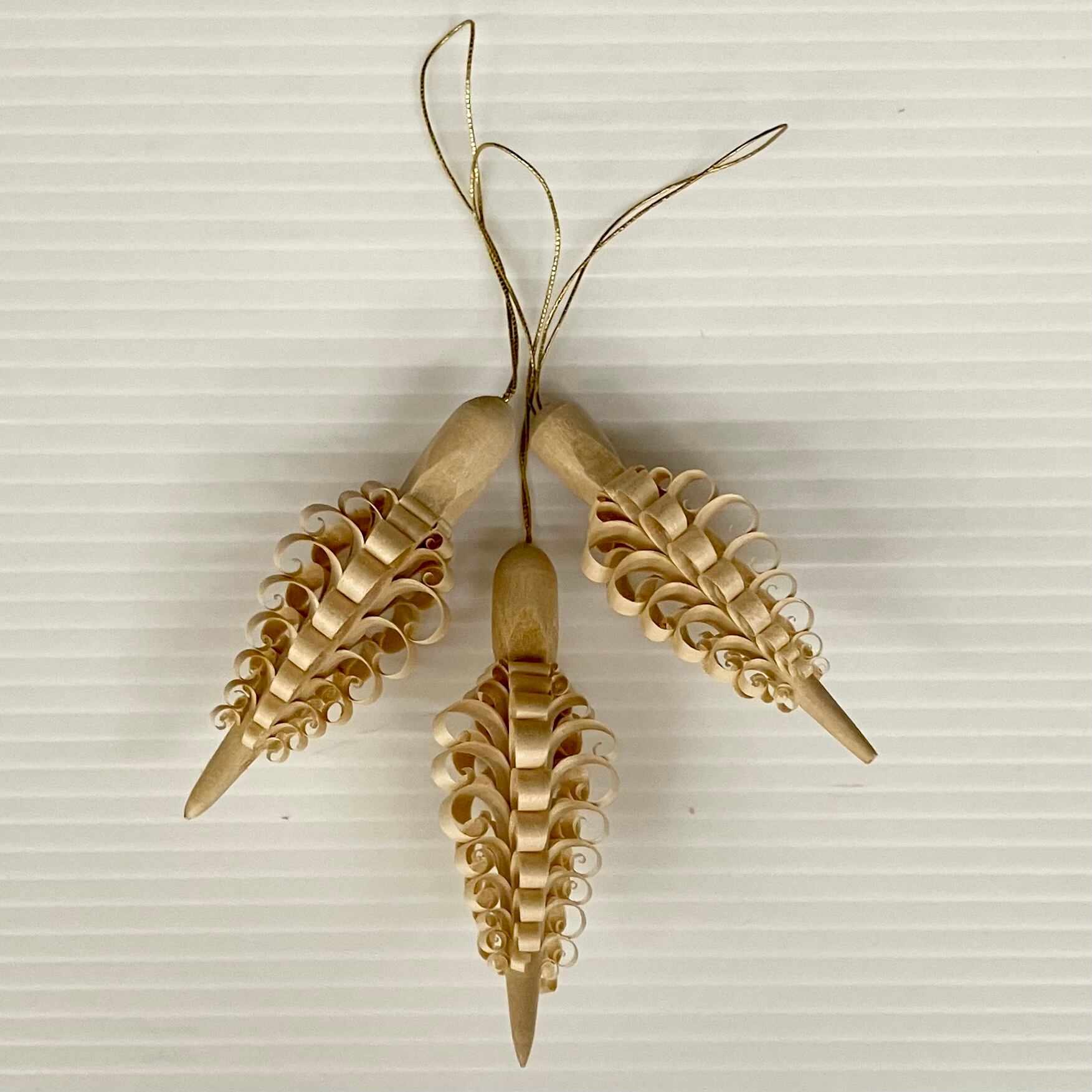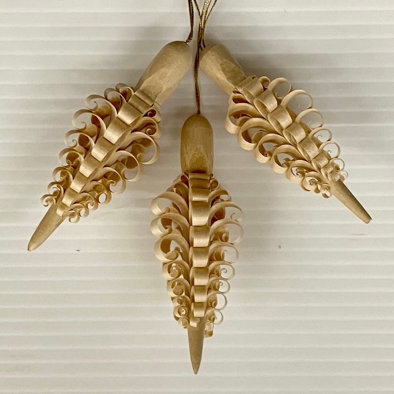 ドイツのザイフェンで作られている削り木のオーナメントです。大きさが分かるように並べてみました(3枚目の写真)。
