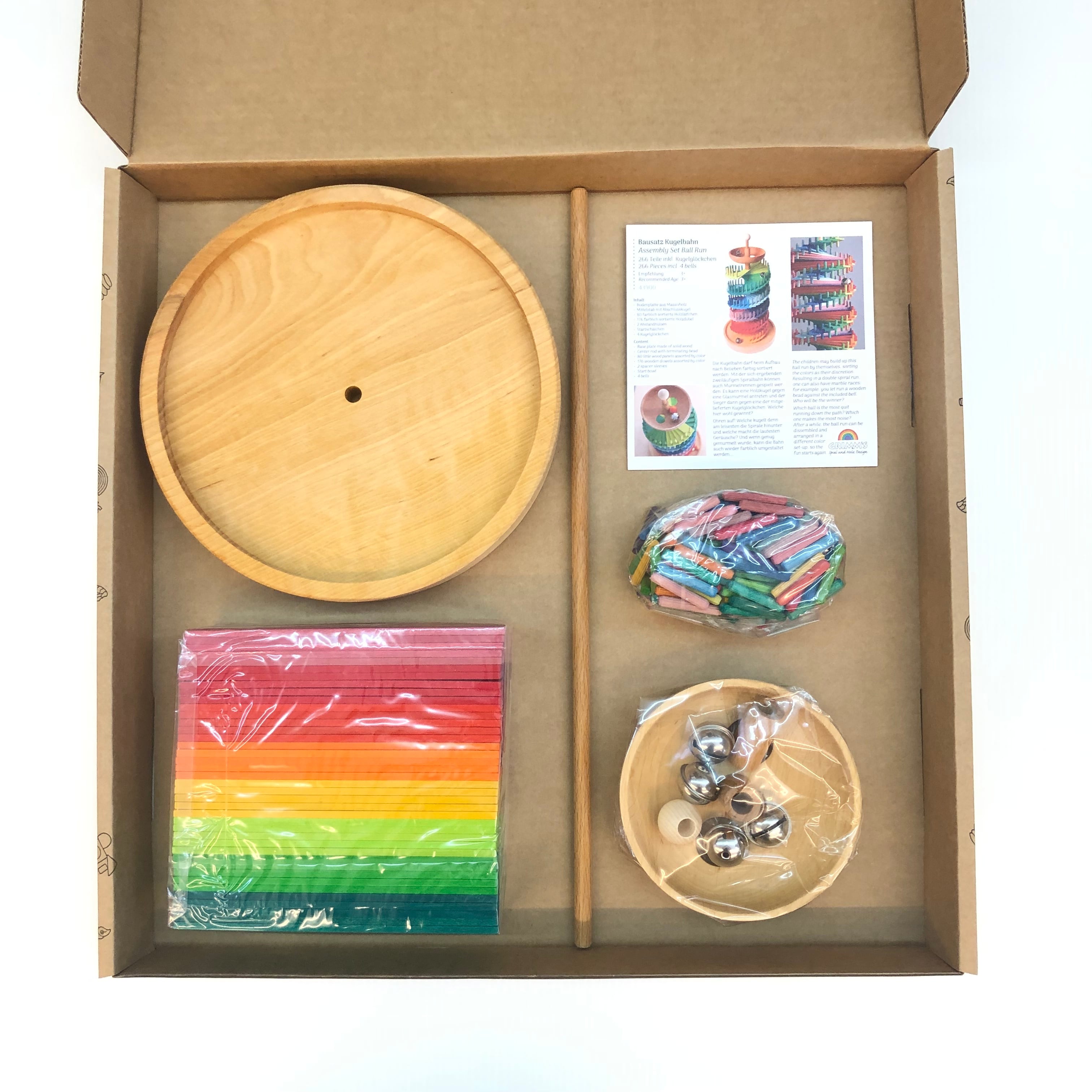 虹色の塔に 虹色の木玉が カラカラと転がる様も楽しいと思います。