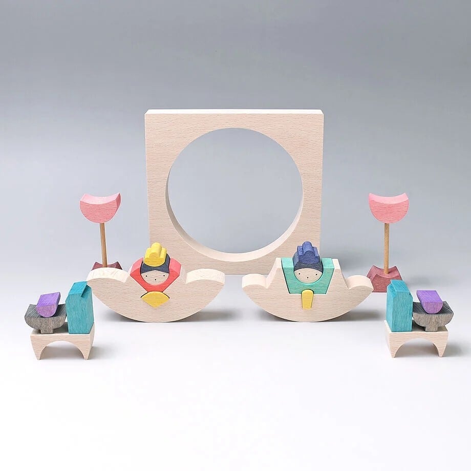 人形10片、調度類12片、丸棒2本で構成され、幅154㎜、高さ148㎜の丸い枠の中にきちんと収まっています。飾る時が組木、お片付けの時が立体パズルになります。